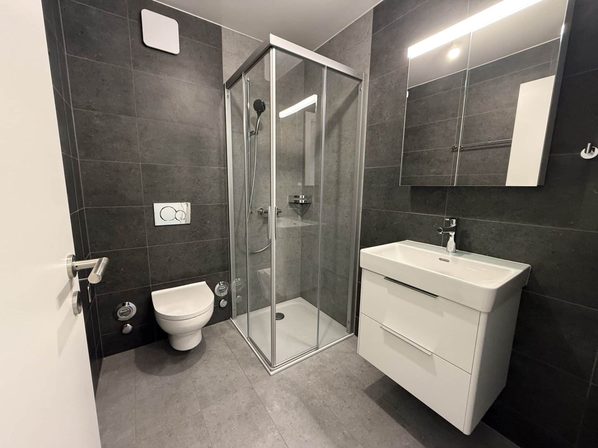 - Salle de bain fonctionnelle : Douche, toilettes, lavabo et miroir dans un agencement optimisé