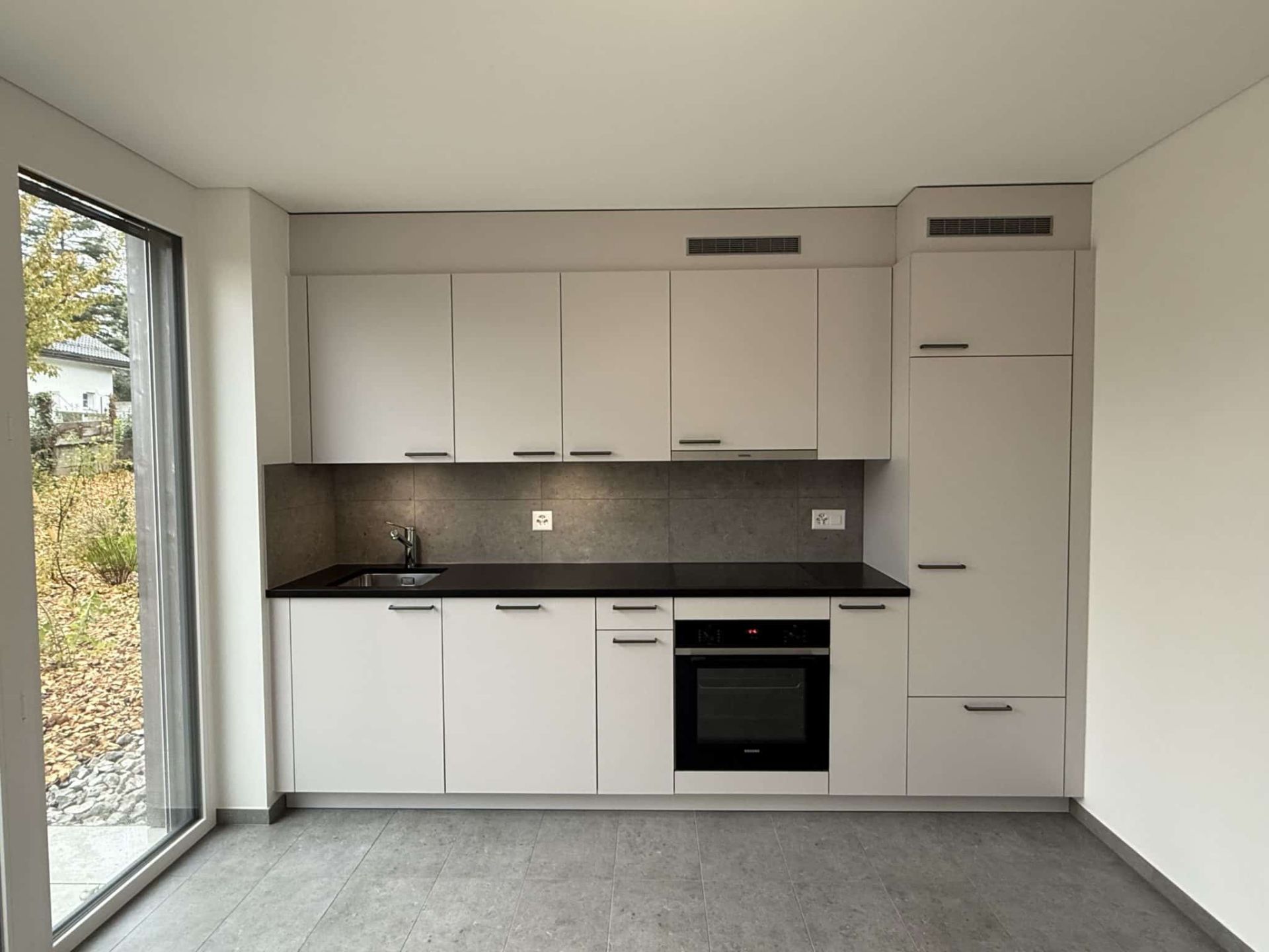 - Cuisine moderne équipée : Armoires blanches élégantes, plan de travail noir, évier en acier inoxydable, four encastré et lave-vaisselle intégré