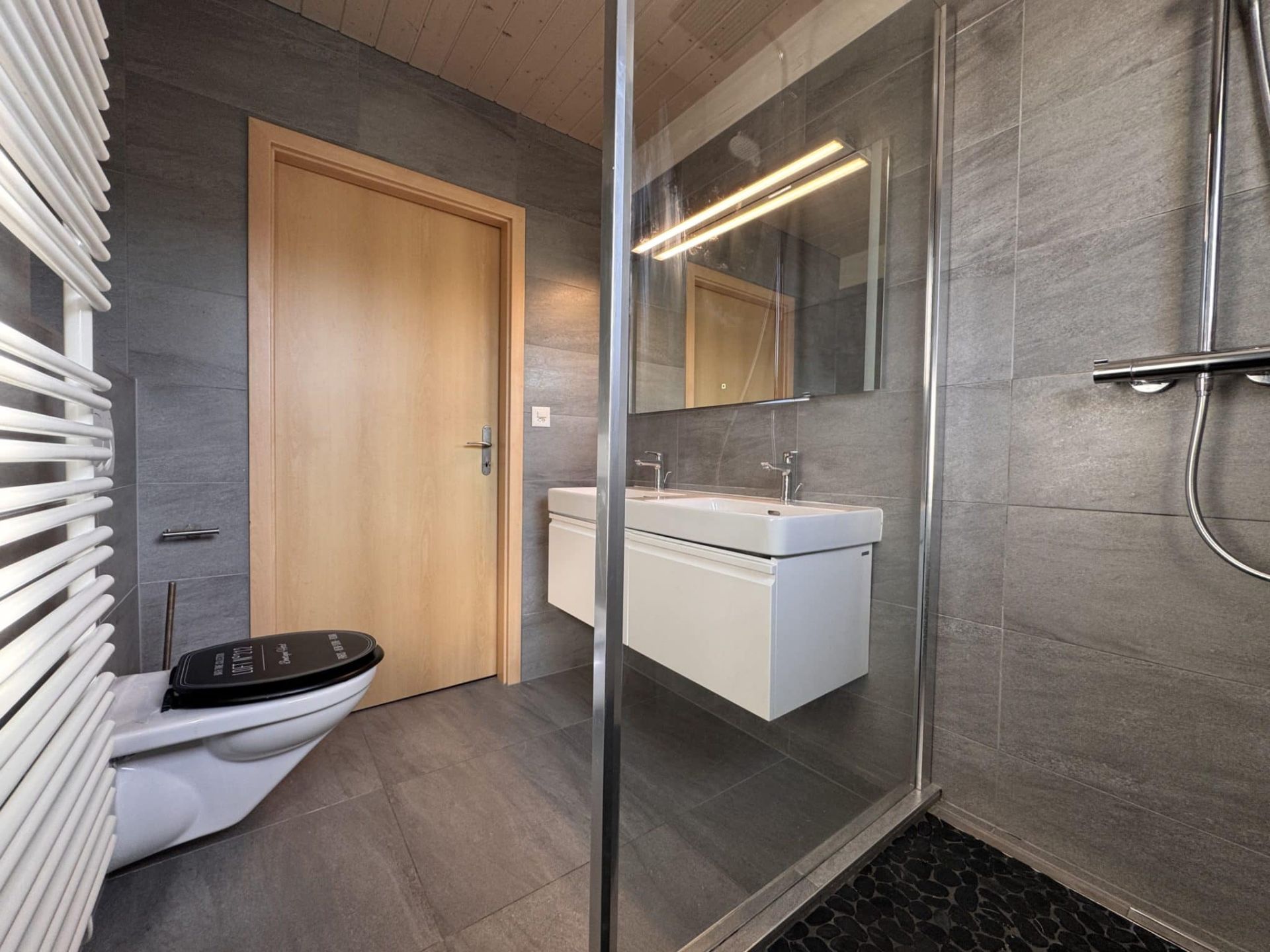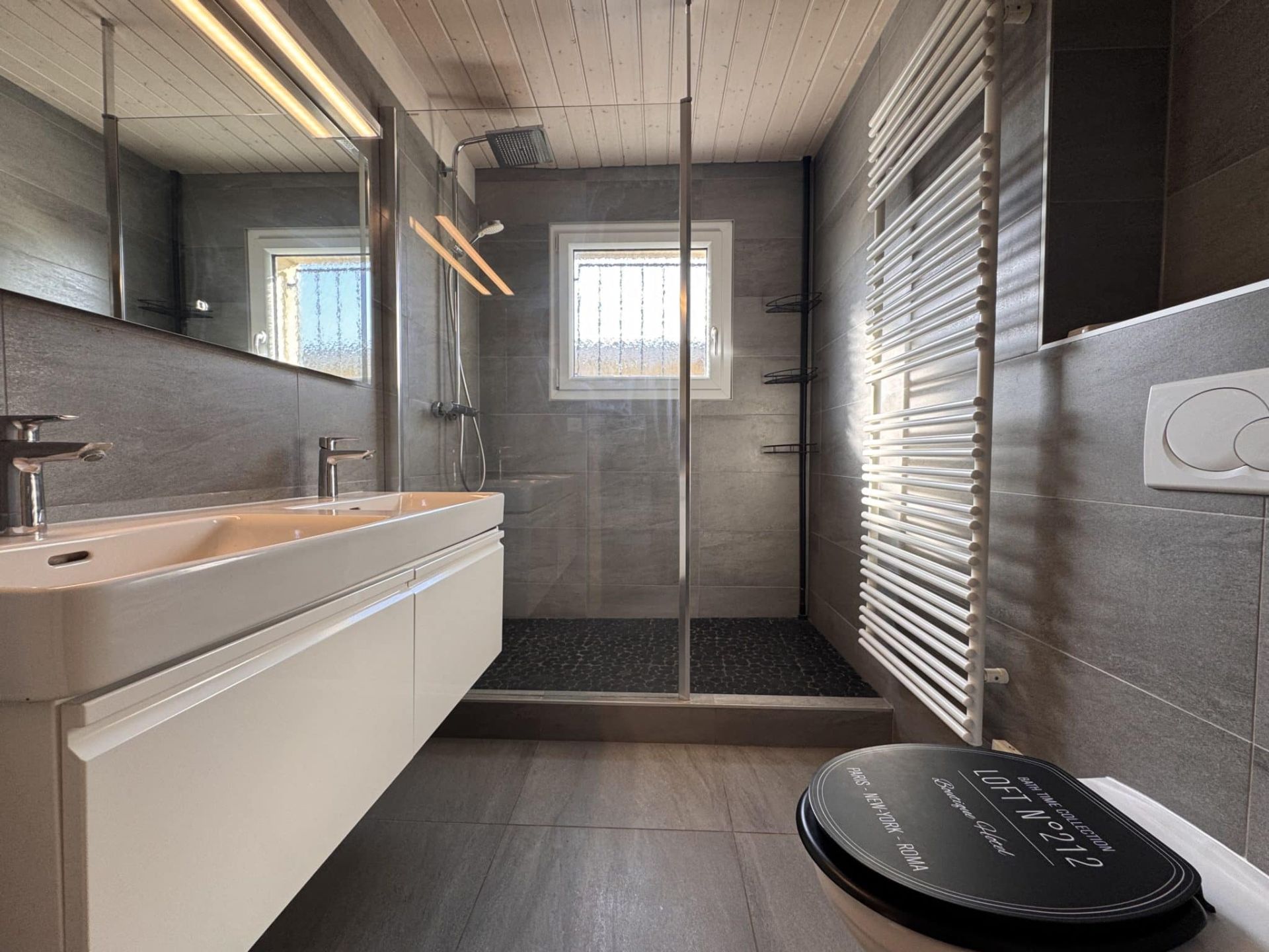 - 1 salle de douche avec double vasques et grande douche italienne
