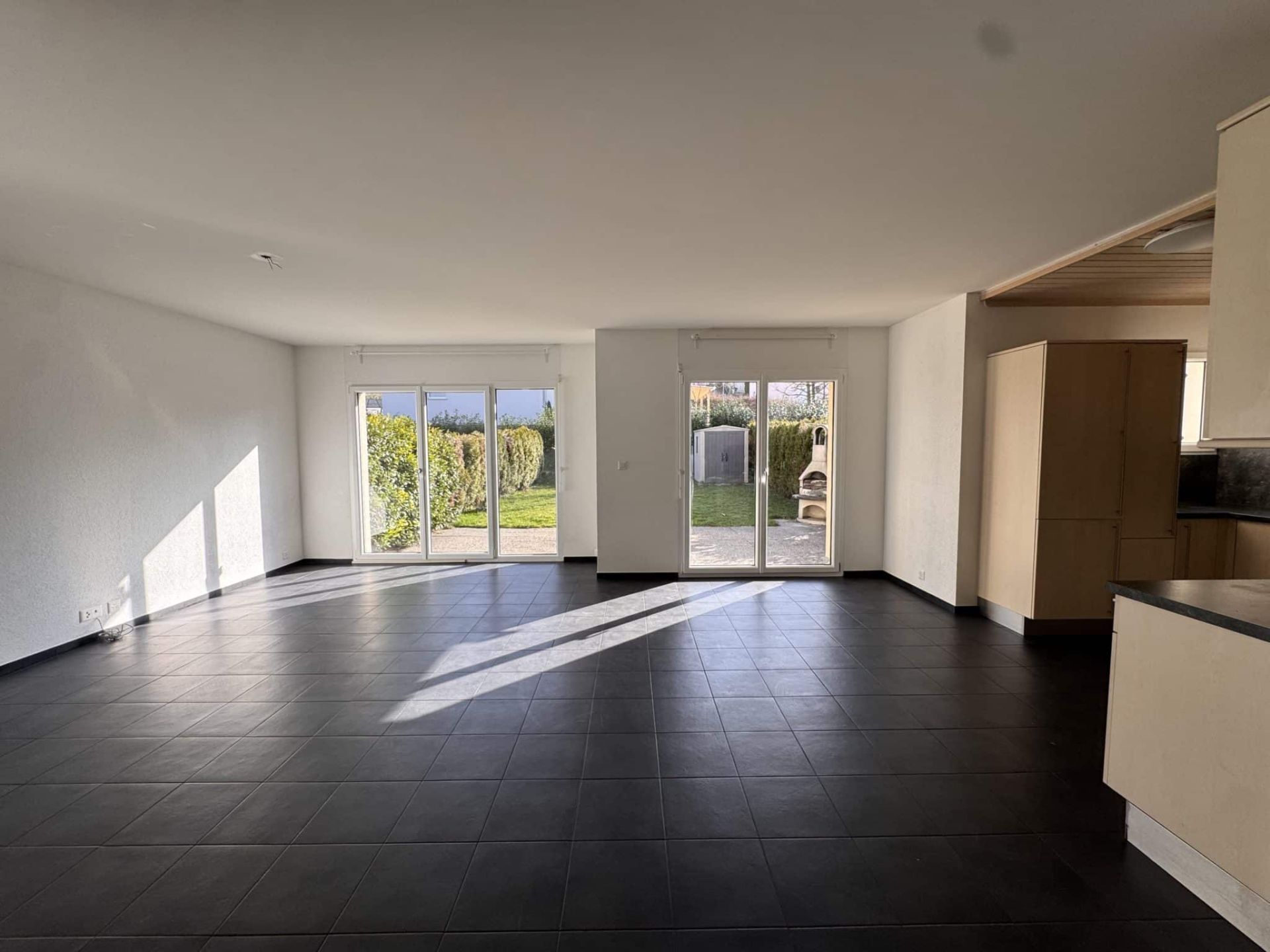 - terrasse avec jardin d’env. 100 m2 entièrement clôturé et équipé d’un cabanon