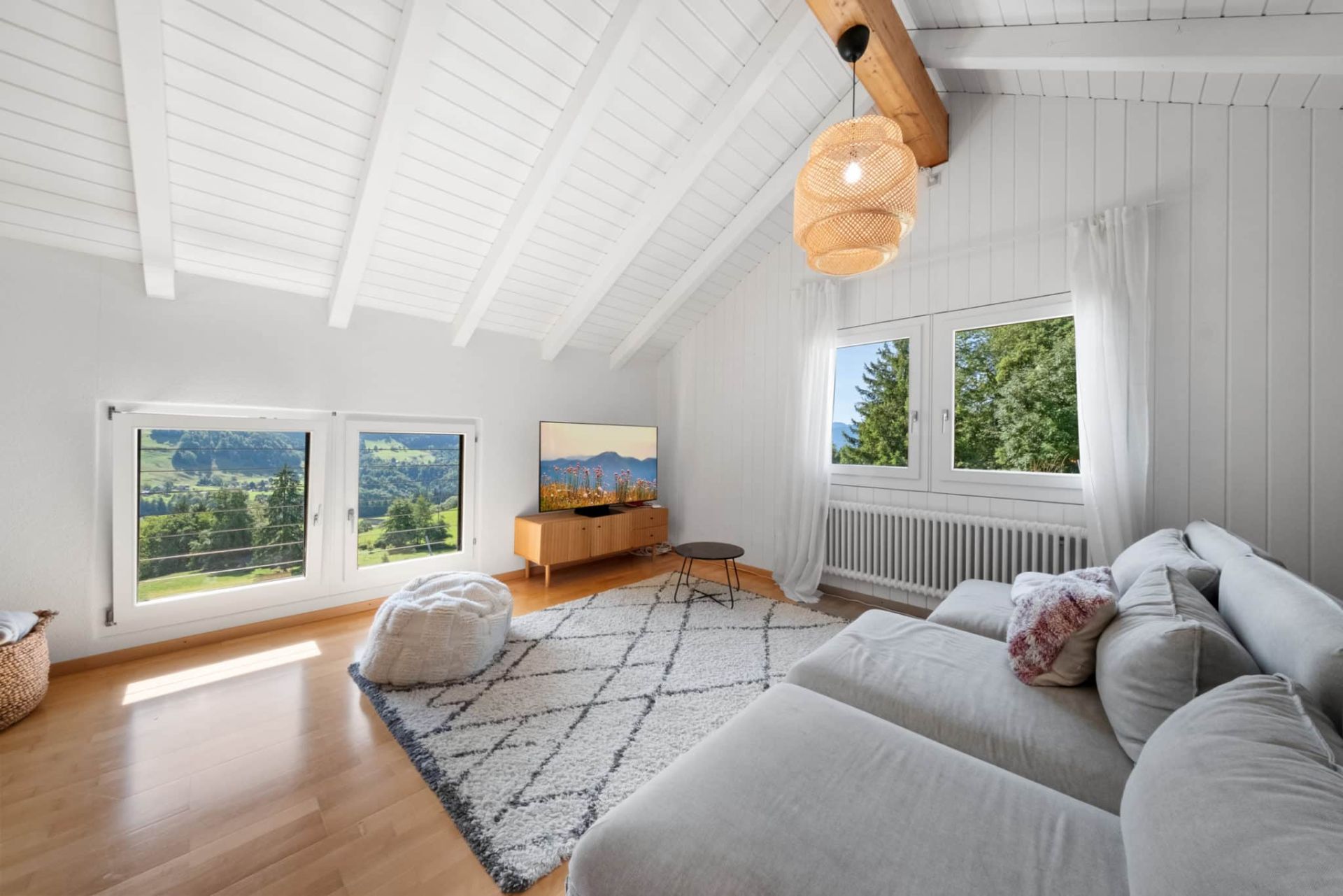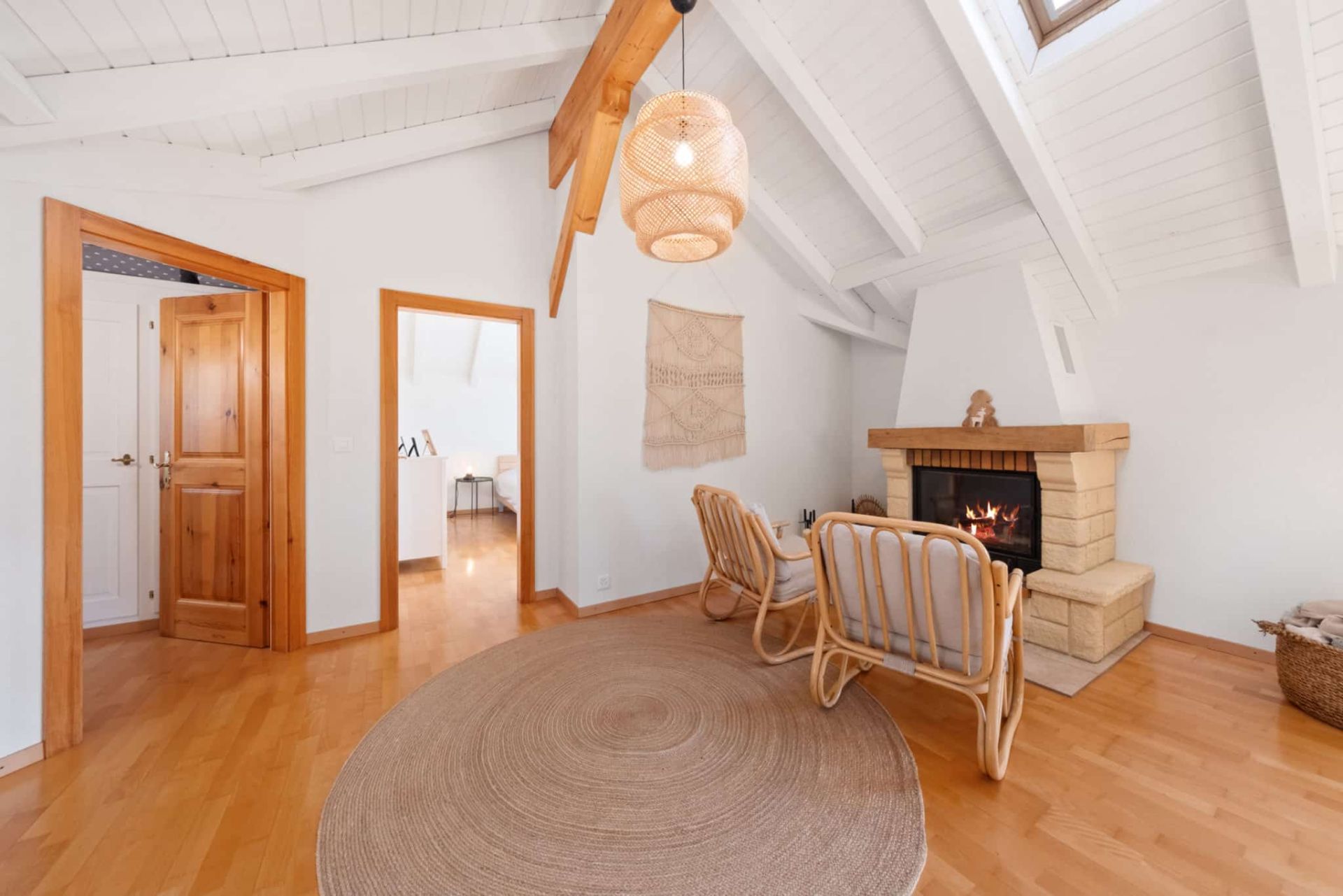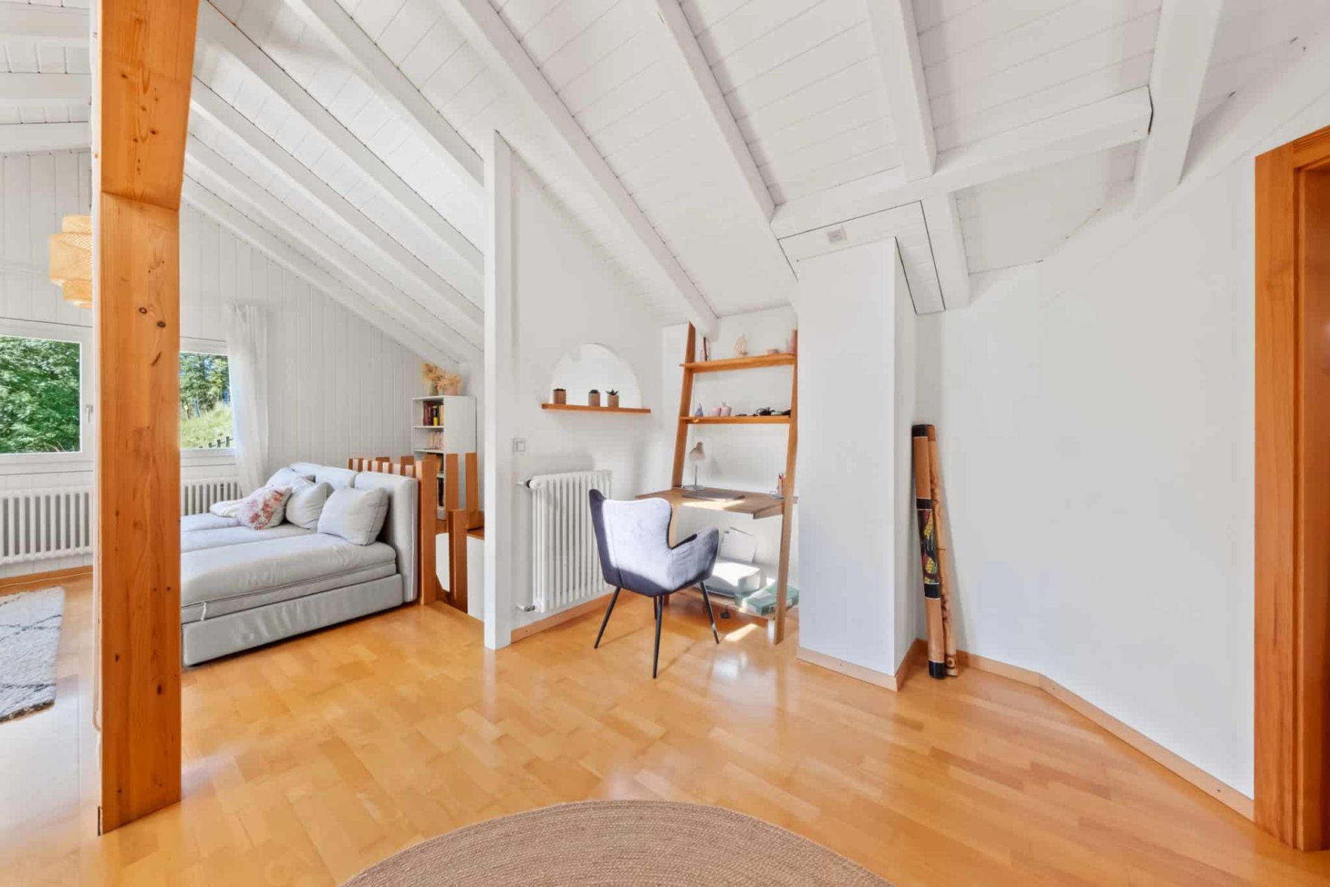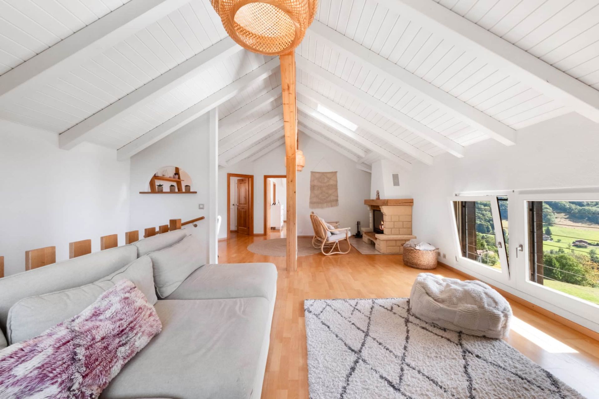 - Ambiance chaleureuse et confortable grâce aux beaux volumes et aux poutres apparentes