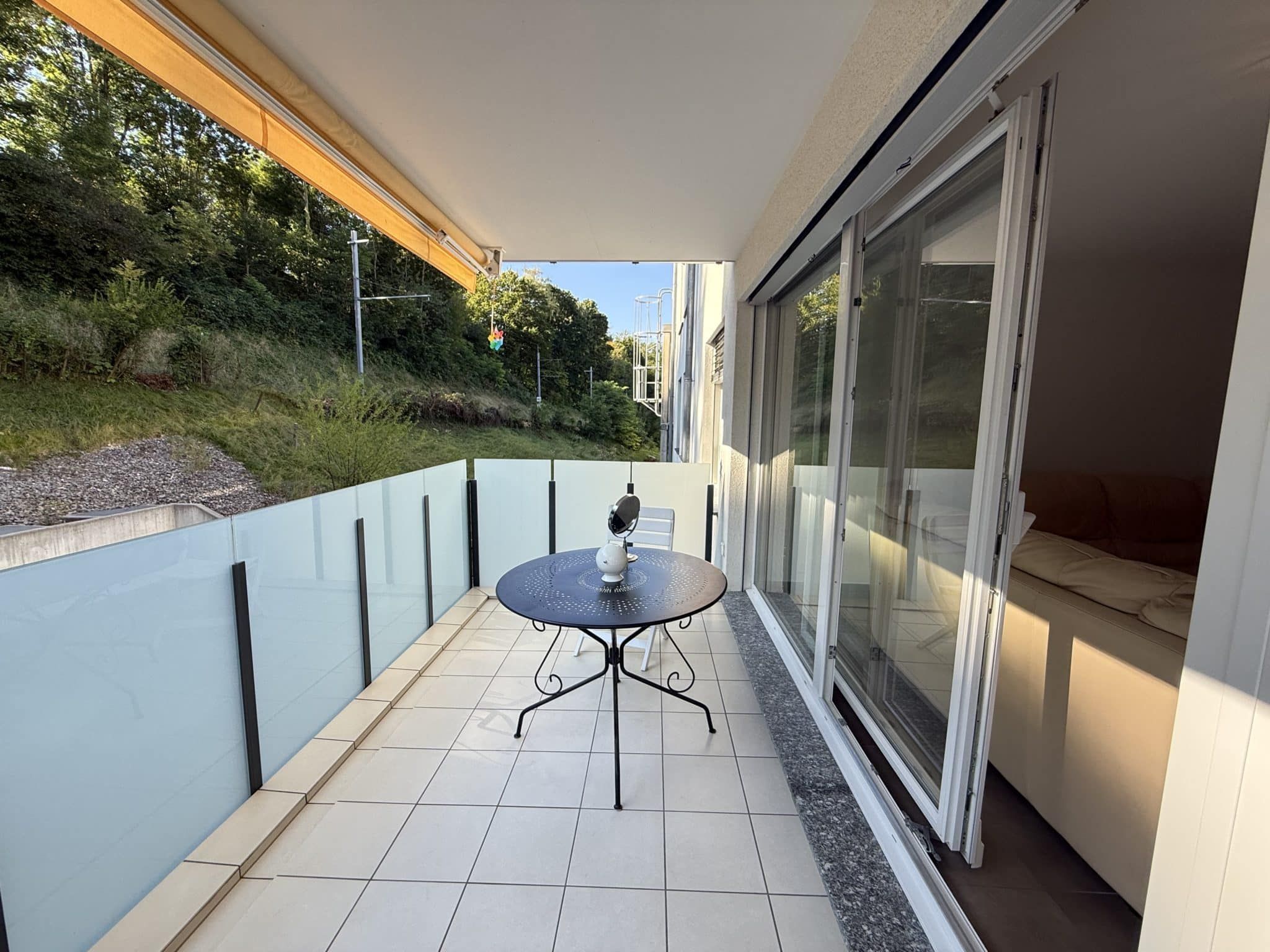 - Un beau balcon orienté à l’est, offrant une vue dégagée sur la verdure et un calme appréciable
