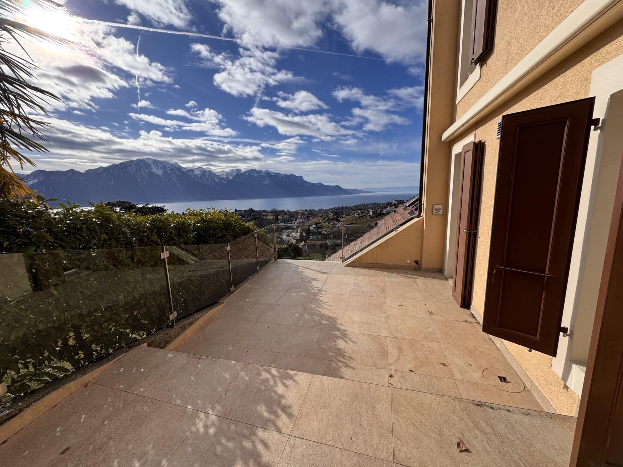 Vaste balcon-terrasse d’env. 18 m² orienté sud-ouest, offrant une vue panoramique exceptionnelle sur le lac et les Alpes